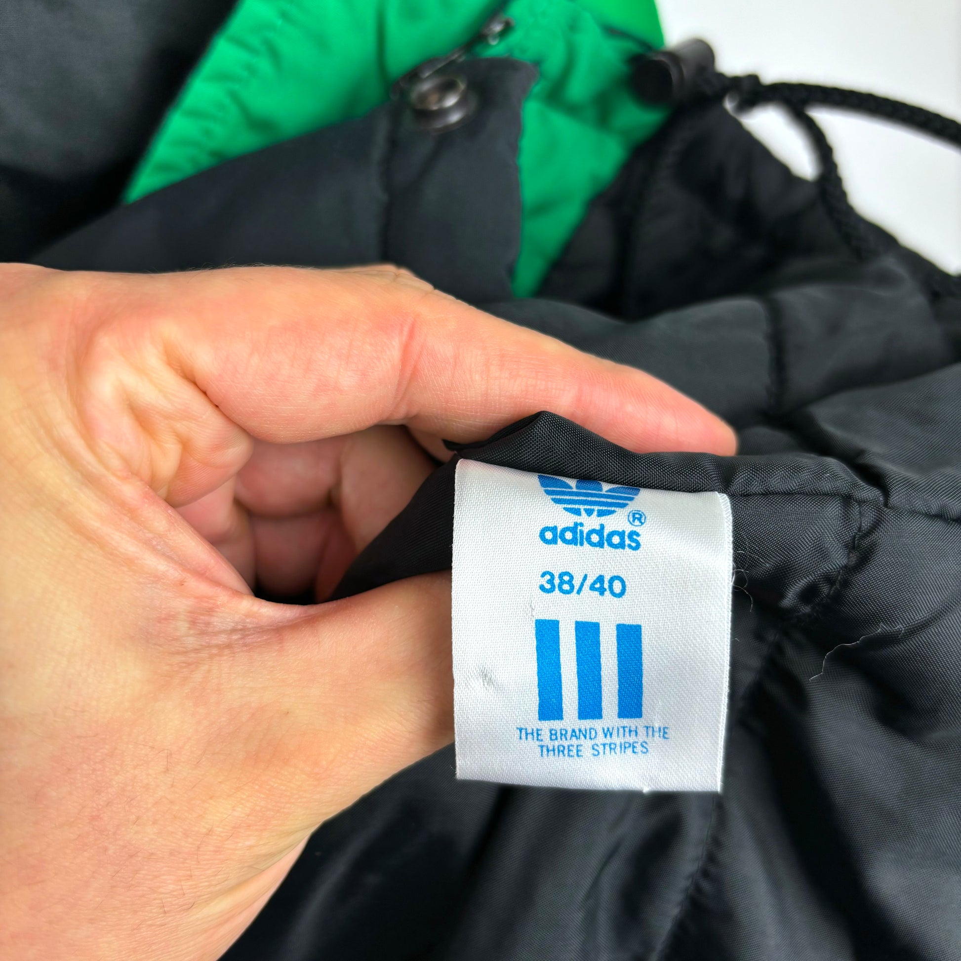 Adidas print to reverse with fabric three stripes. Adjustable toggles at bottom hem.